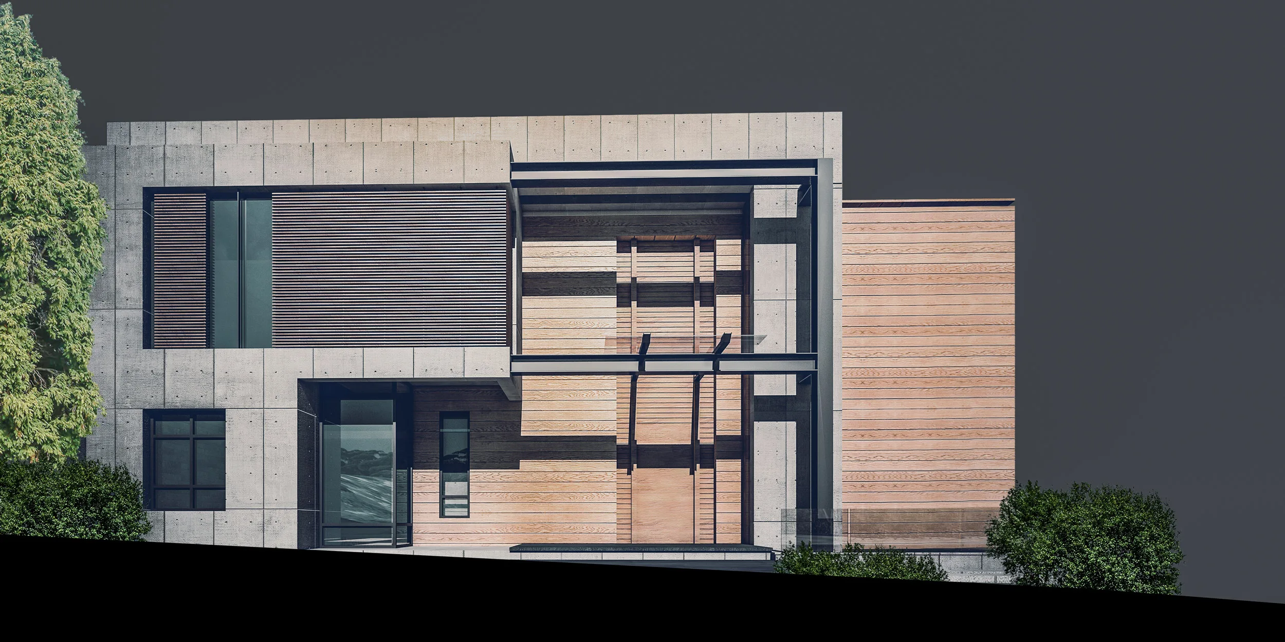 Material selection plays a fundamental role in expressing the modern character of the house. A restrained palette of wood, exposed cement, and glass is employed to enhance simplicity, authenticity, and durability. These materials are used strategically to articulate volumes and emphasize the contrast between solid and transparent elements.