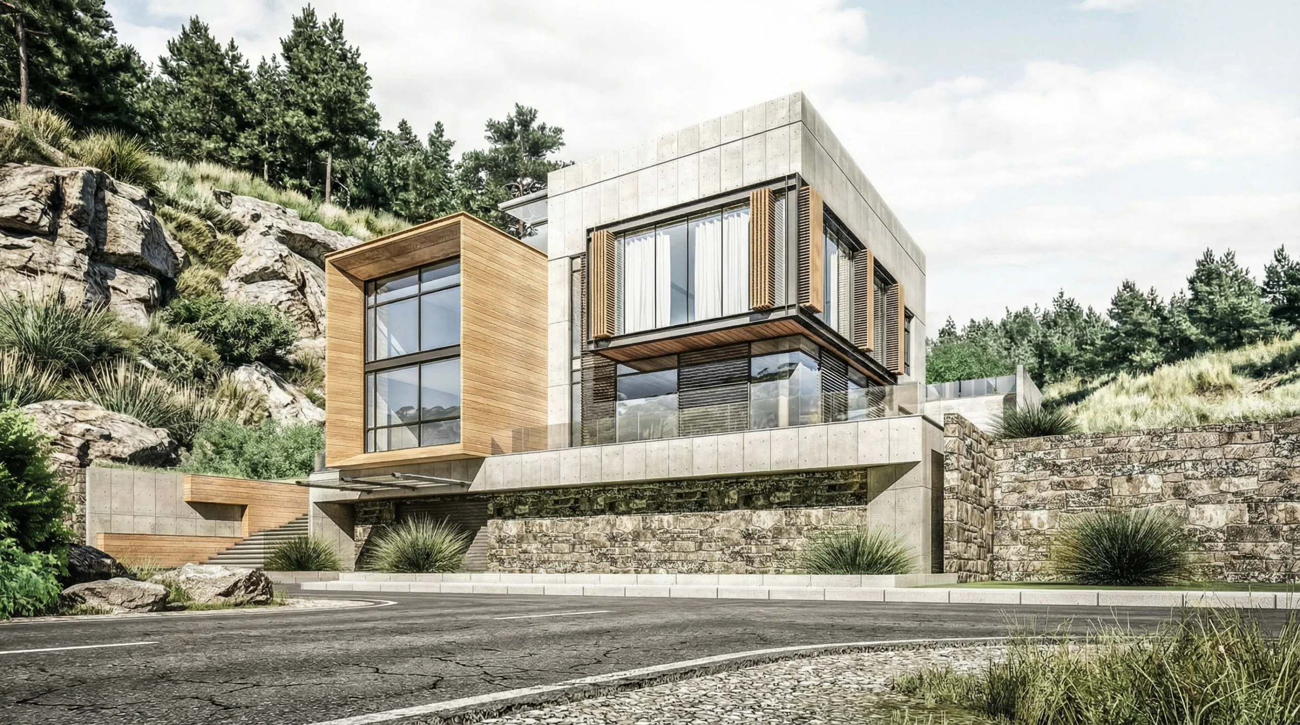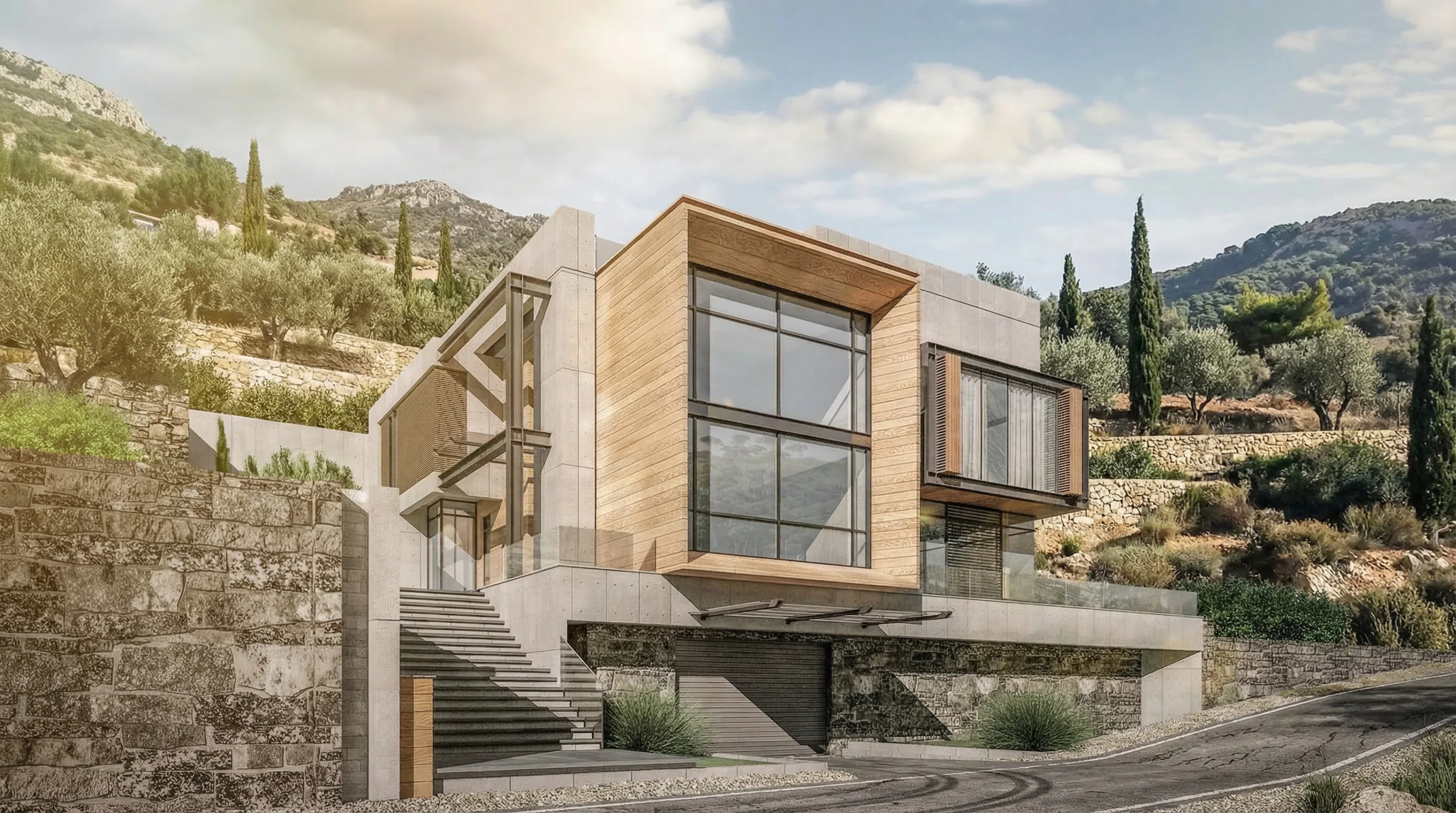The composition of volumes reflects the internal functional organization of the house, allowing the program to be legible from the exterior. Public living spaces—including the reception area, living room, and salons—are housed within a prominent wooden volume characterized by expansive glazed façades, maximizing transparency and framing uninterrupted sea views. Private functions are contained within a larger cement volume, providing a sense of enclosure and privacy. The master bedroom is distinguished through dynamic glass openings that open directly toward the landscape.