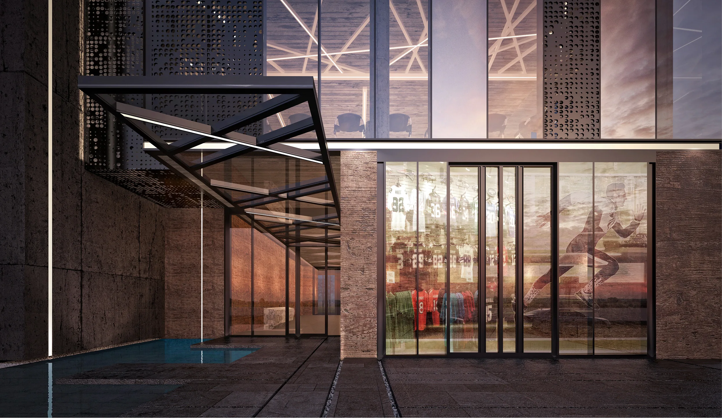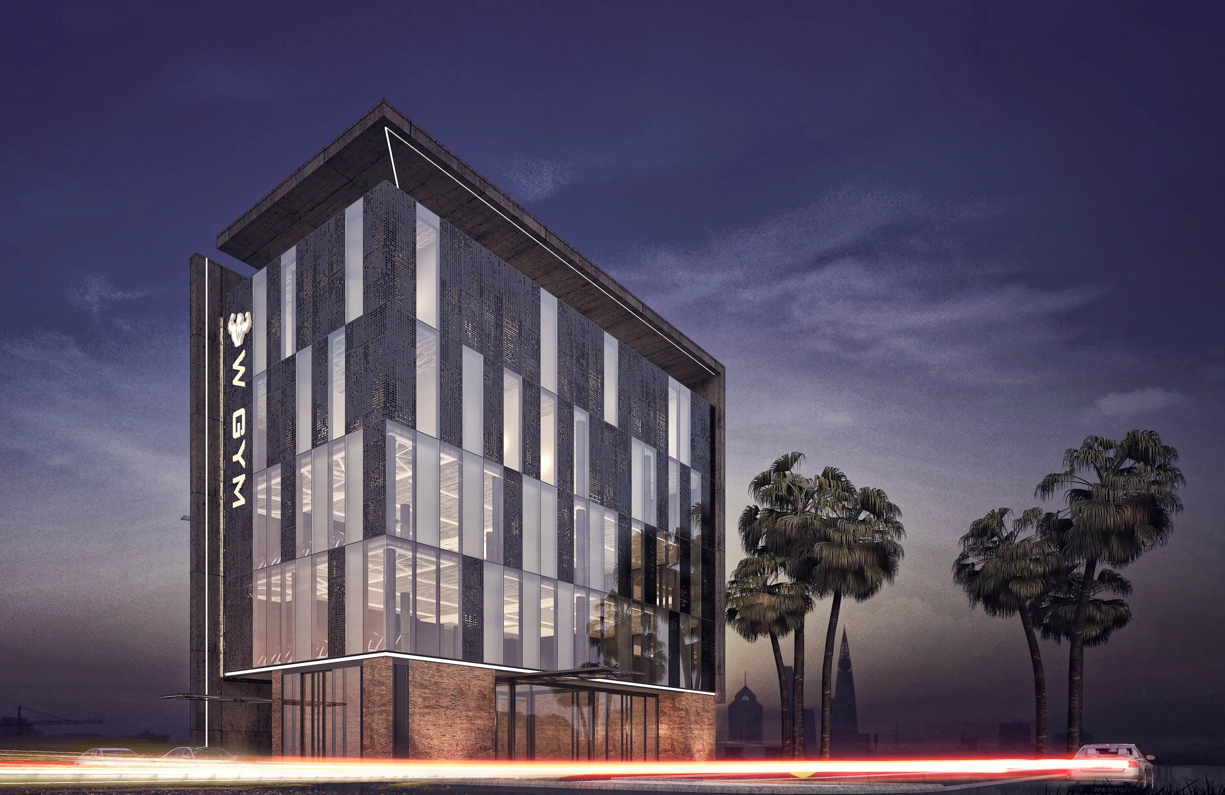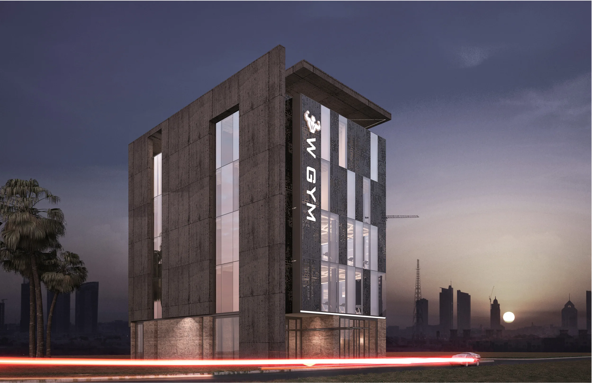 The design philosophy of W GYM centers on “Tectonic Transparency” and “Programmatic Layering.” Located in a dense urban context, the building is conceived as a monolithic volume wrapped in a high-performance glass curtain wall, punctuated by a rigid concrete frame. This juxtaposition creates a visual dialogue between the “heaviness” of the structure and the “lightness” of the interior voids. The facade utilizes vertical mullions and perforated metal screens to manage solar gain—a critical consideration in Kuwait’s climate—while maintaining a visual connection with the street. The entrance is marked by a dramatic cantilever and linear LED integration, leading visitors over a reflective water feature that serves as a sensory transition from the external heat to the controlled internal environment.