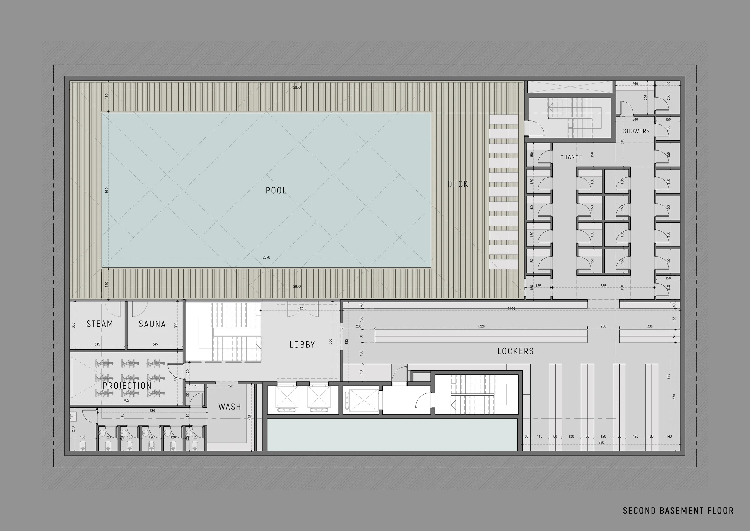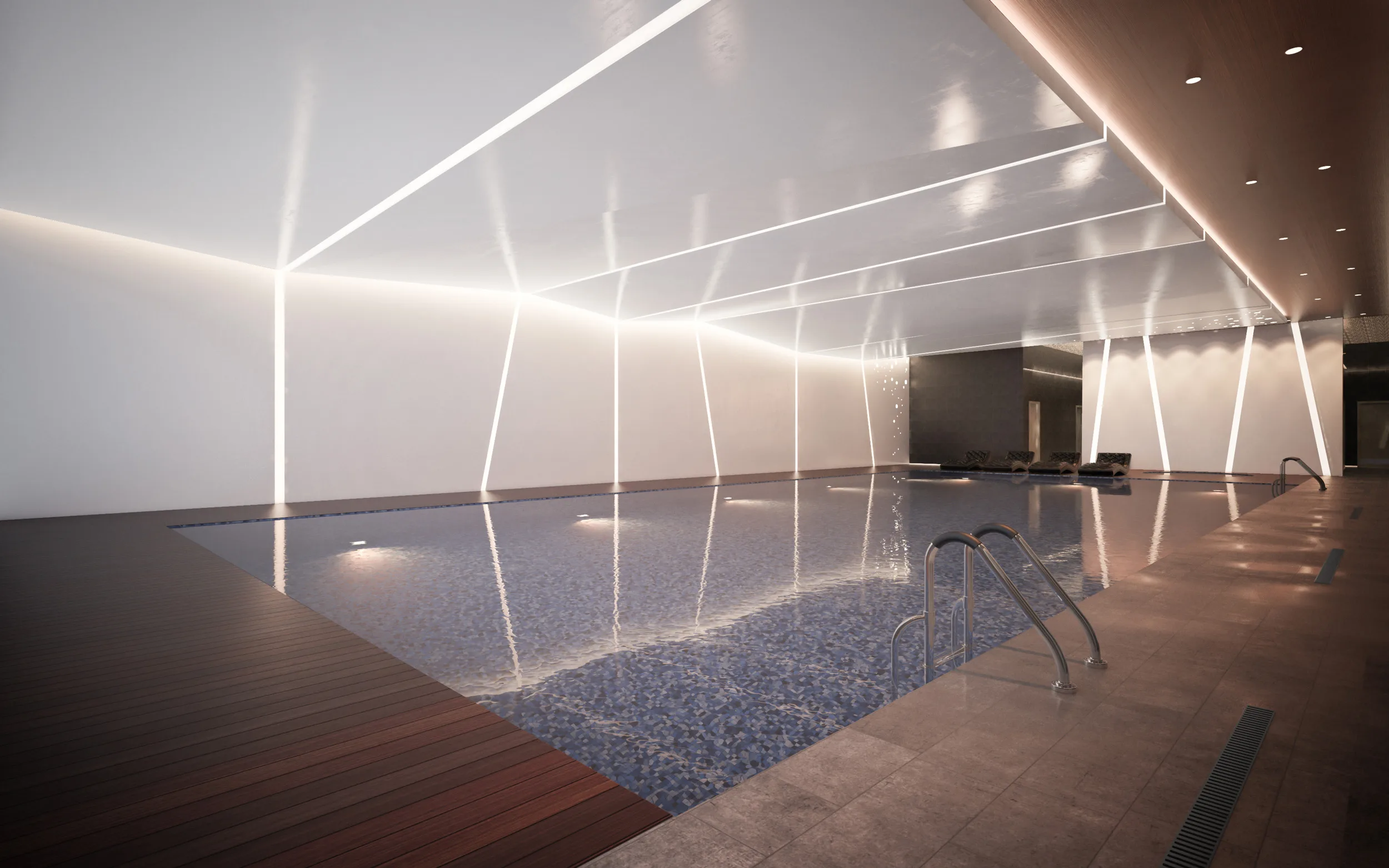 The Subterranean Wellness Sanctuary (B2): The lowermost level is dedicated to recovery. It features a minimalist lap pool defined by a rhythmic sequence of wall-integrated light coves and a warm timber deck. This level includes state-of-the-art steam and sauna rooms, prioritizing a serene, atmospheric quality through indirect lighting and a neutral material palette.