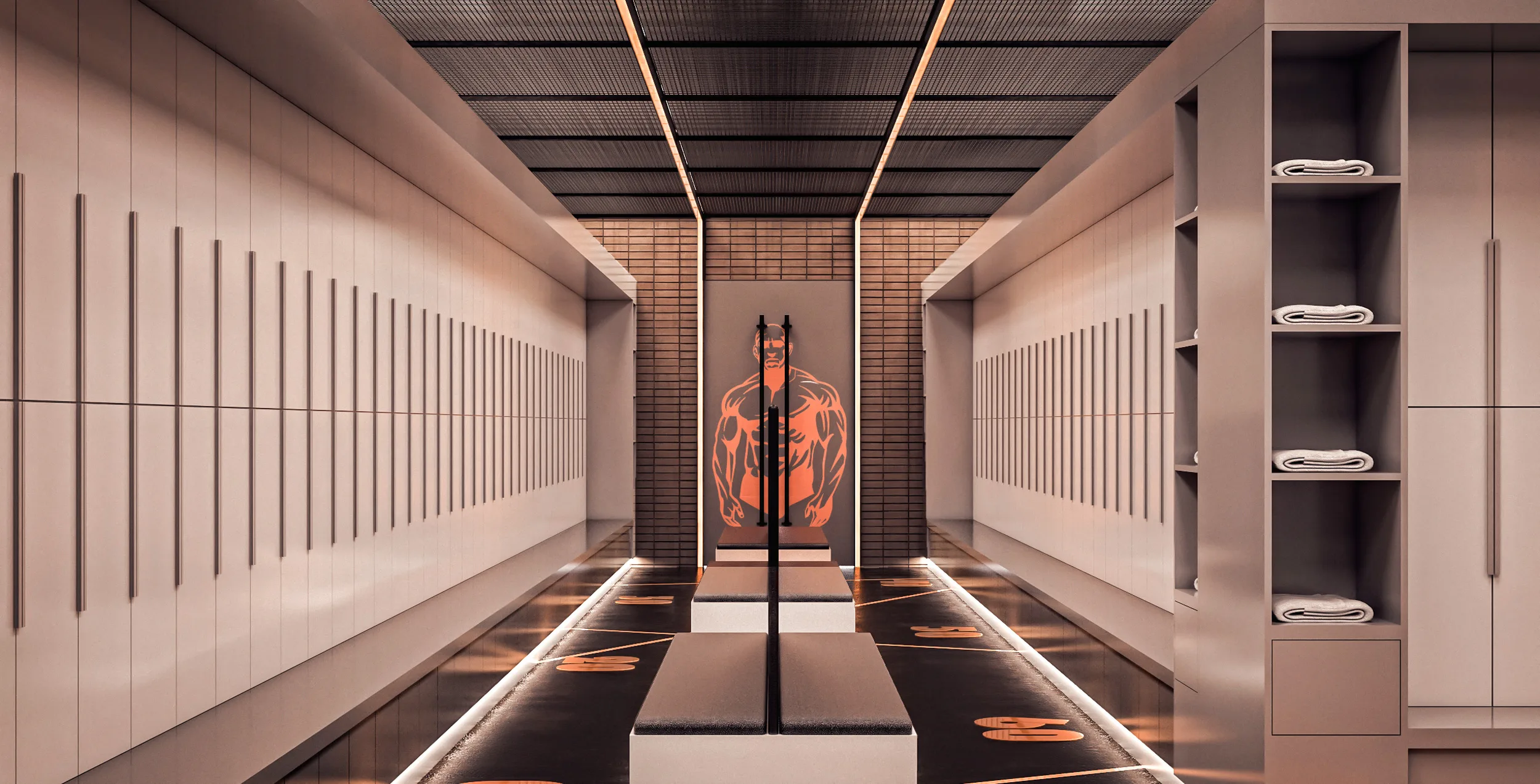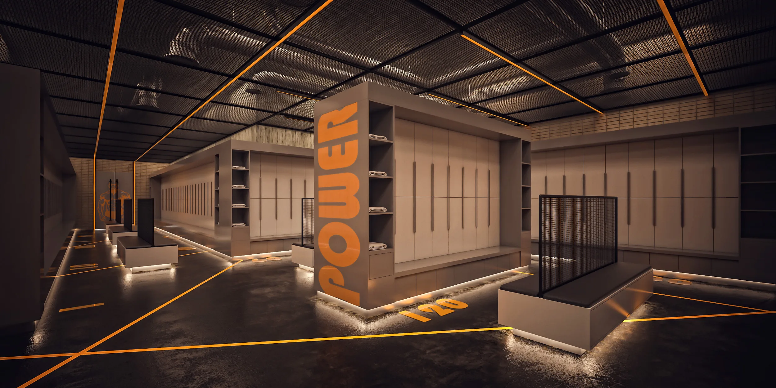 The interior language is characterized by a “Industrial Chic” palette—polished concrete floors, exposed matte-black ceilings, and stainless steel accents. A key architectural element is the Scenographic Lighting System; linear LED strips are used not only for illumination but as a wayfinding tool, tracing the geometry of the space and guiding the user’s eye. Large-scale environmental graphics, such as the bold “POWER” typography on structural columns, are integrated as architectural elements rather than mere decoration, reinforcing the brand’s identity and the building’s energetic purpose.