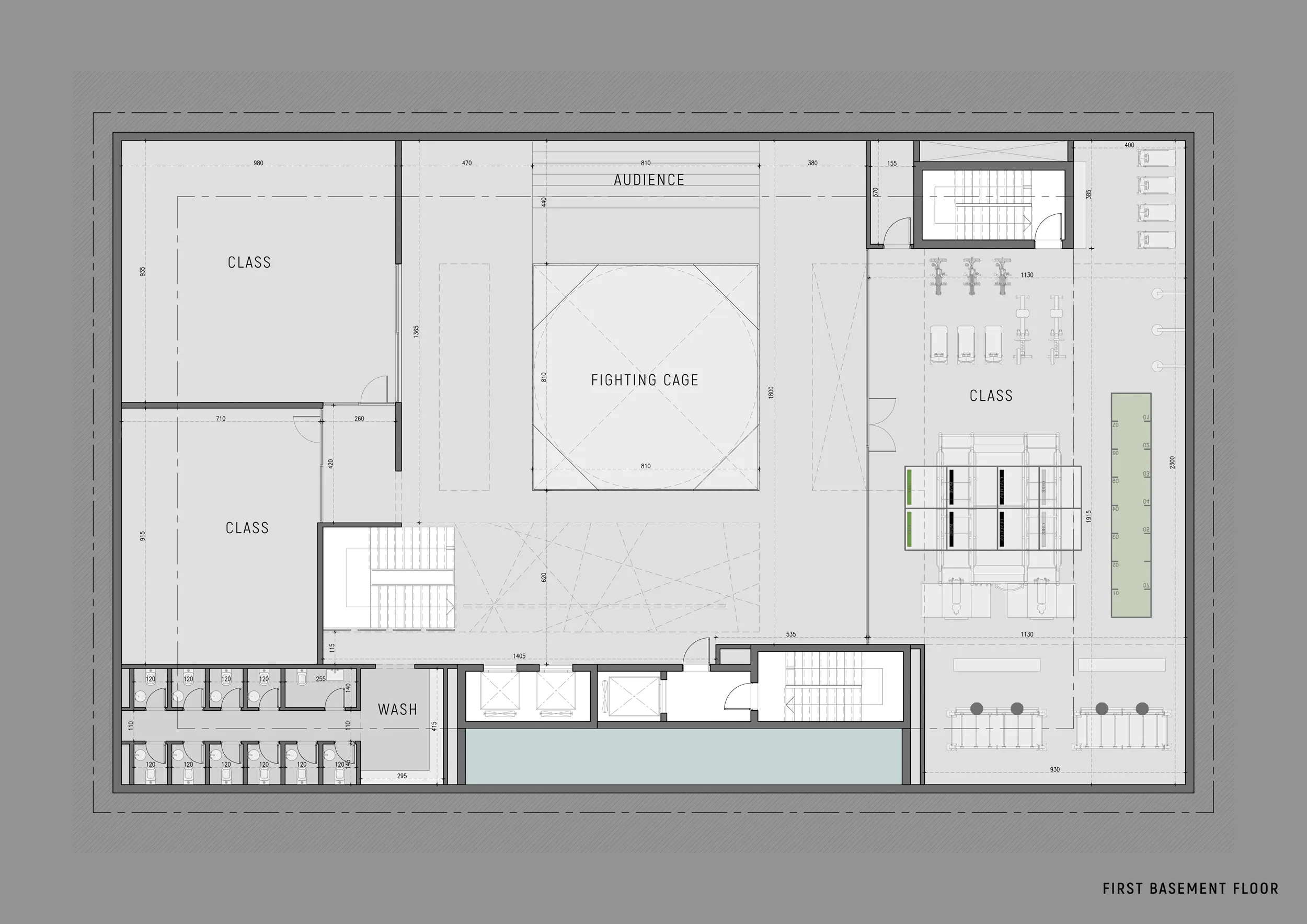 The Combat Arena (B1): Designed for high-intensity training, this level centers around a professional fighting cage and a tiered audience area. The spatial arrangement emphasizes the drama of the sport, utilizing a “void” that connects visually to the floors above, enhancing the sense of verticality.