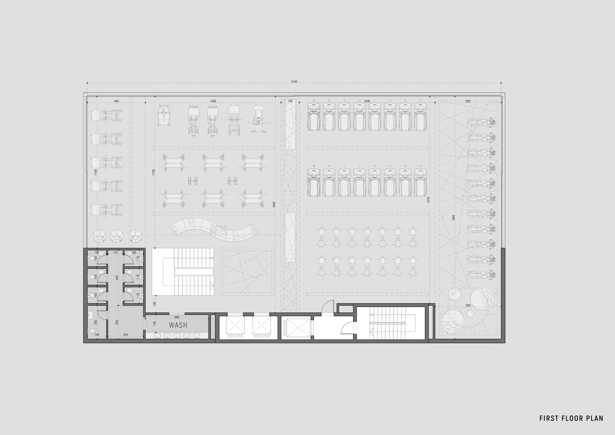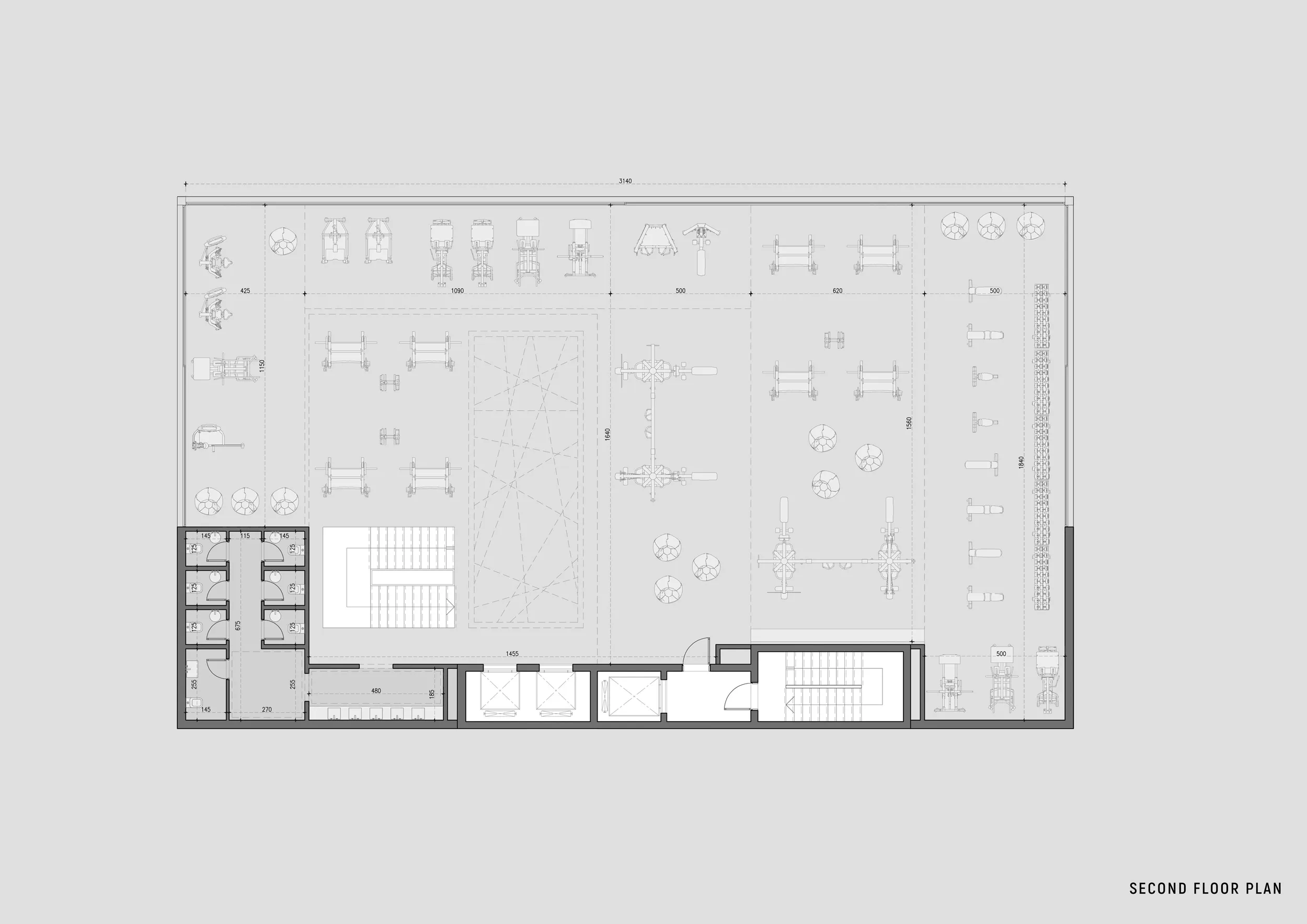 High-Performance Training Zones (1st & 2nd Floors): These levels utilize an open-plan configuration to maximize flexibility. The first floor focuses on cardio and functional movements, while the second floor is dedicated to heavy resistance training. The layout is engineered to optimize user flow, with dedicated “wash” zones and locker facilities strategically placed to minimize cross-traffic.