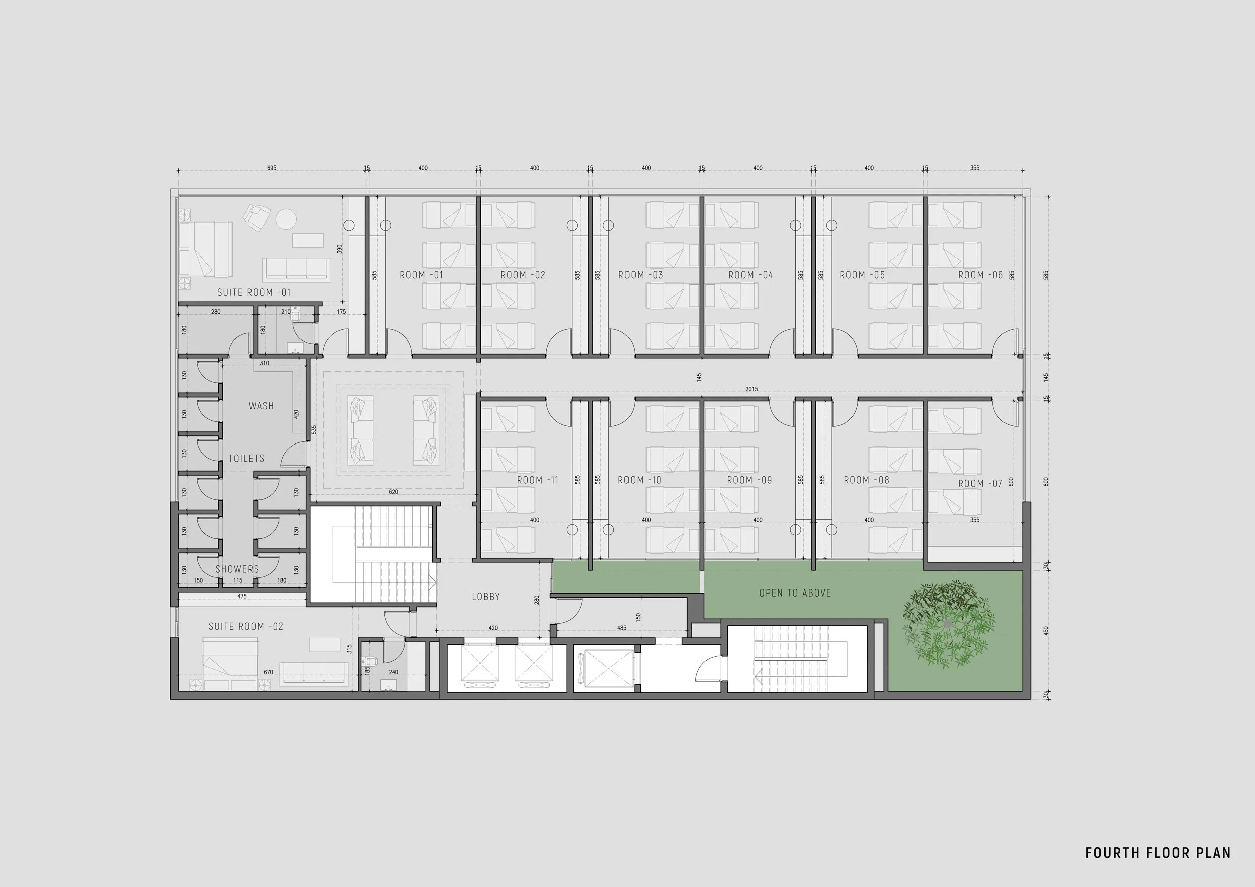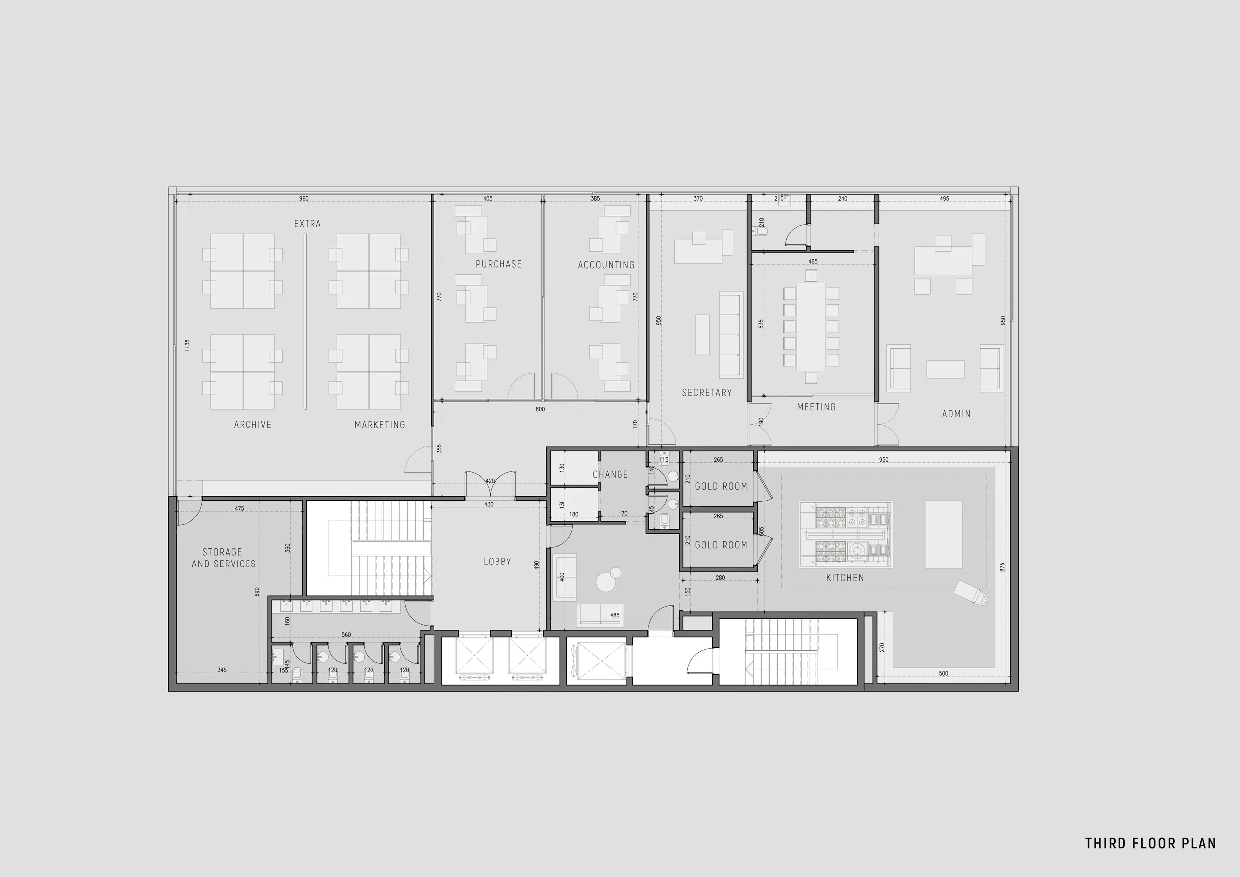 The Operational Brain (3rd Floor): The uppermost level consolidates the administrative functions, including executive offices, a conference room, and a specialized commercial kitchen designed to support the facility’s nutritional programs.